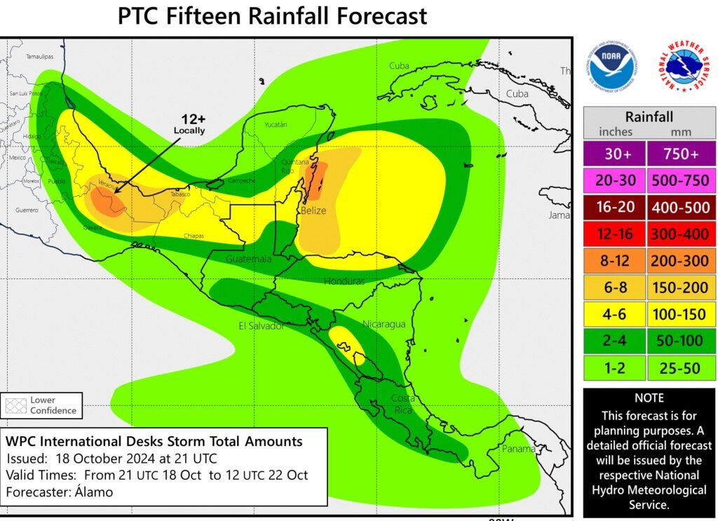 Es posible que, se produzcan áreas localizadas de inundaciones repentinas a lo largo de la trayectoria del potencial ciclón tropical quince mientras avanza hacia el oeste a través del sur de la Península de Yucatán, norte de Guatemala y el territorio de Belice.