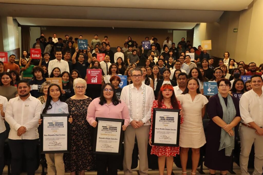 Para finalizar, se otorgaron los reconocimientos del Premio “Ciudadanía y Acción Voluntaria” en las categorías: STEM para Nina Alejandra Poot Esteban; en Salud para Alison Michelle Vázquez González; Igualdad de Género Alejandra Koyoc González; y Labor Social Azalía Abigail May Ceballos.