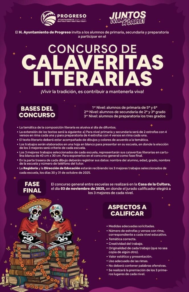 Progreso, Yuc 16 de oct.-Con el lema “¡Vivir la tradición es contribuir a mantenerla viva!”, el Ayuntamiento de Progreso busca motivar a niñas, niños y jóvenes de todo el municipio a preservar una de las tradiciones más representativas y creativas del Día de Muertos: las Calaveritas Literarias, cuyo concurso se realizará el lunes 3 de noviembre en la Casa de la Cultura.