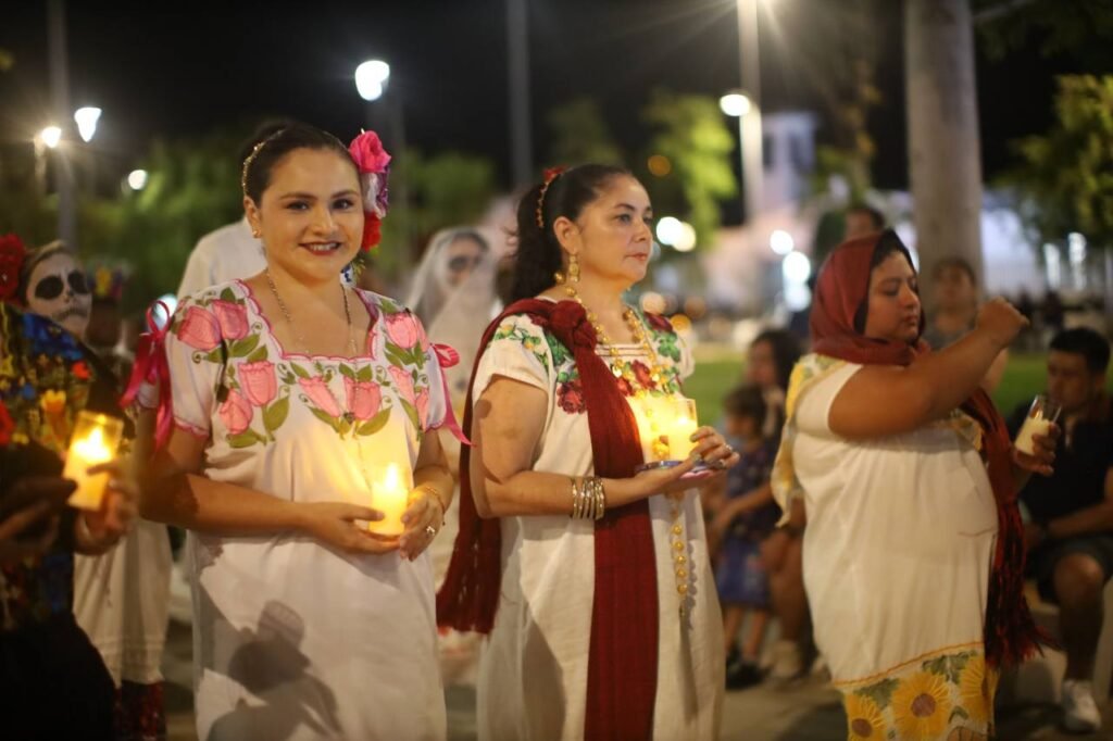 Antes de la procesión, niñas, niños y adultos disfrutaron en el parque principal de Chelem de “Noches de Leyendas”, actividad realizada por las bibliotecas municipales mediante teatro guiñol para acercar relatos regionales a la comunidad.