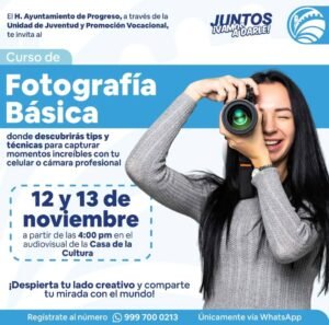 Progreso, Yuc 9 de nov.- El Ayuntamiento de Progreso, encabezado por el alcalde Erik Rihani González, a través de la Unidad de Juventud y Promoción Vocacional, invita a las y los jóvenes del municipio a participar en el Curso de Fotografía Básica, que se llevará a cabo los días 12 y 13 de noviembre a las 4:00 p.m. en el audiovisual de la Casa de la Cultura.