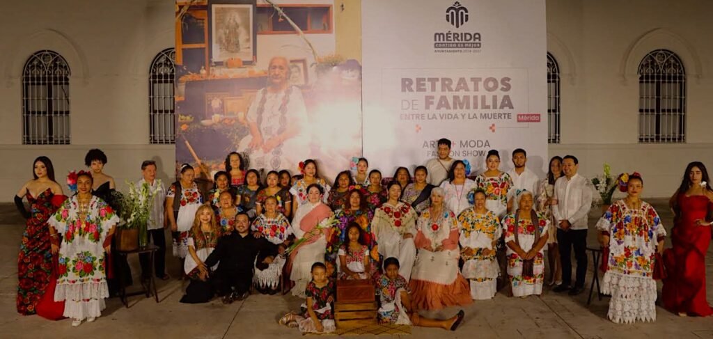 La pasarela tuvo lugar en el Parque de la Paz como parte del Mérida Arte + Moda Fashion Show, con una puesta en escena que recreó la estética de los retratos familiares tradicionales de principios del siglo XX. Mujeres y hombres modelaron indumentaria artesanal elaborada en Mérida y comunidades como Ixil, San José Oriente y Kimbilá.