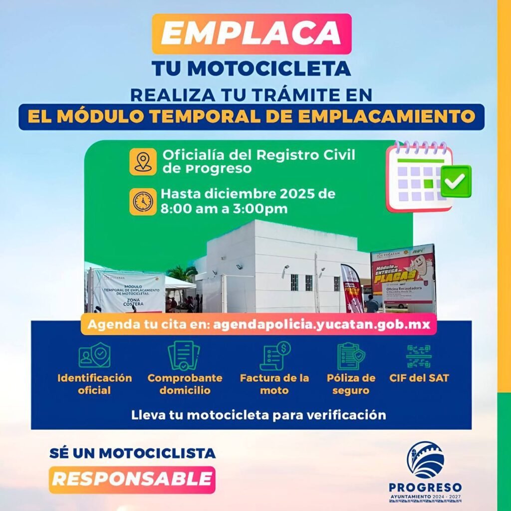 Progreso, Yuc 24 de nov.-El Ayuntamiento de Progreso, a través de la Dirección de Seguridad Pública y Tránsito (DSPT), reiteró su llamado a las y los motociclistas del municipio a realizar el trámite de regularización de sus vehículos en el Módulo de Emplacamiento Temporal, el cual permanecerá en operación hasta diciembre de 2025.