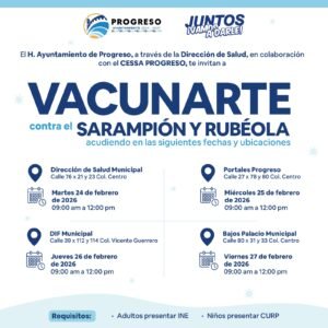 Progreso, Yuc, 22 de feb. – Con el objetivo de fortalecer la salud pública y prevenir enfermedades que pueden evitarse mediante la vacunación, el H. Ayuntamiento de Progreso, encabezado por el alcalde Erik José Rihani González, a través de la Dirección de Salud y en coordinación con el CESSA Progreso, invita a la ciudadanía a participar en la jornada de vacunación contra el sarampión y la rubéola, que se llevará a cabo en distintas sedes del municipio durante la presente semana.