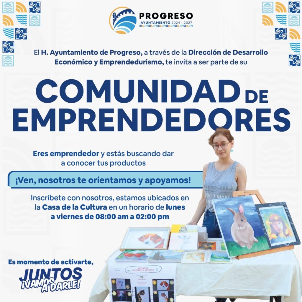 Progreso, Yuc, 24 de feb. – El H. Ayuntamiento de Progreso, encabezado por el alcalde Erik Rihani González, invita a las y los emprendedores del municipio a formar parte de la Comunidad de Emprendedores, una iniciativa impulsada a través de la Dirección de Desarrollo Económico y Emprendedurismo que busca brindar orientación y acompañamiento a quienes desean fortalecer sus proyectos y dar mayor proyección a sus productos o servicios.