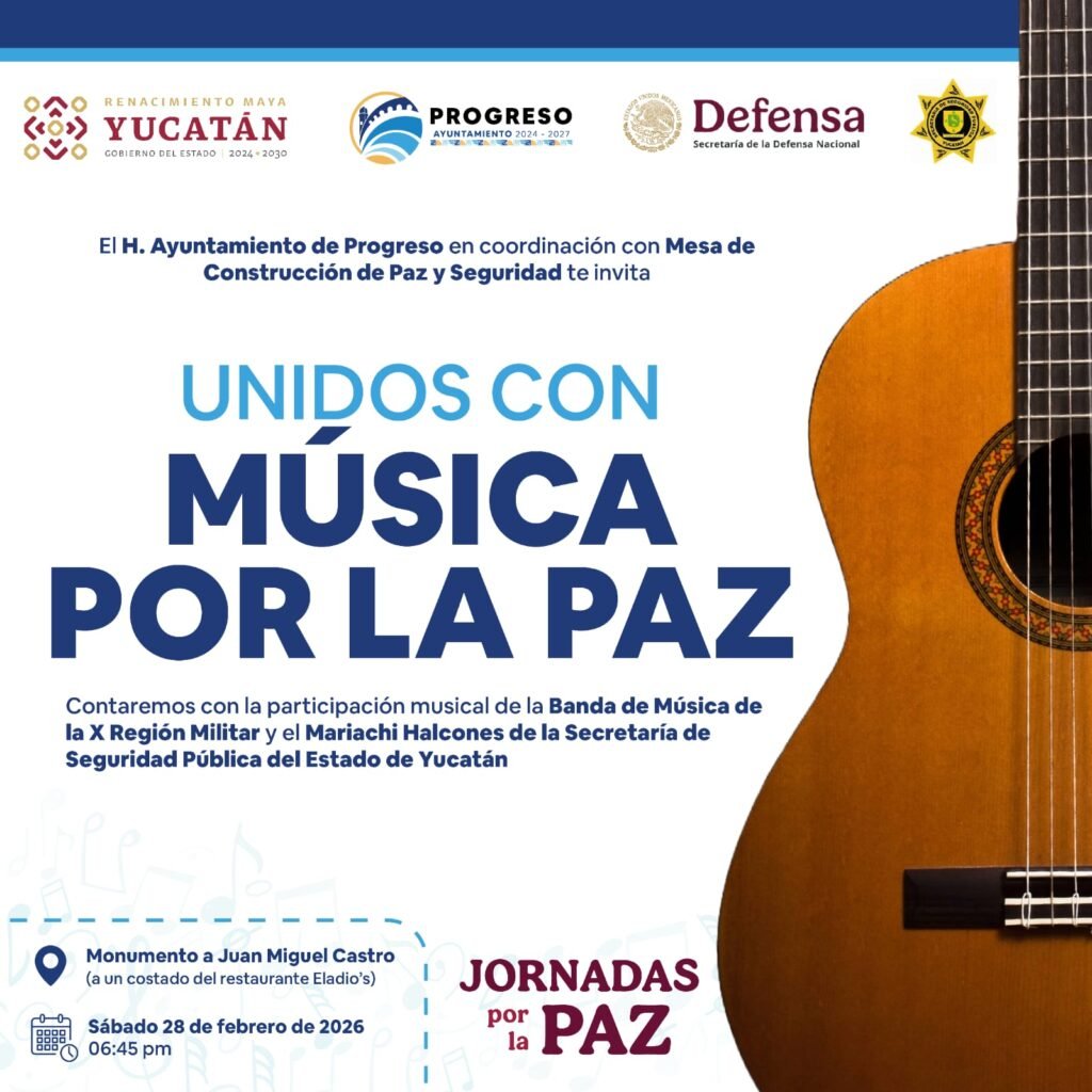 Progreso, Yuc 24 de feb. – Con el objetivo de fortalecer el tejido social, fomentar la sana convivencia y promover un mensaje de armonía entre las y los habitantes del municipio, el H. Ayuntamiento de Progreso, encabezado por el alcalde Erik Rihani González, en coordinación con la Mesa de Construcción de Paz y Seguridad, invita a la ciudadanía al evento “Unidos con música por la paz”.