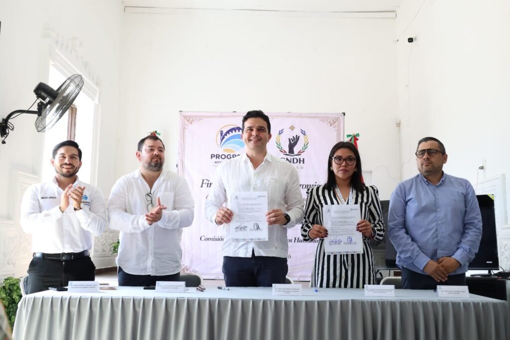Progreso, Yuc 9 de mar.– Con el objetivo de fortalecer la formación en materia de derechos humanos entre el personal del servicio público municipal, el Ayuntamiento de Progreso, encabezado por el alcalde Erik Rihani González, llevó a cabo la firma de una carta compromiso con la Comisión Nacional de los Derechos Humanos (CNDH), mediante la cual se impulsarán programas de capacitación dirigidos a diversas dependencias del municipio.