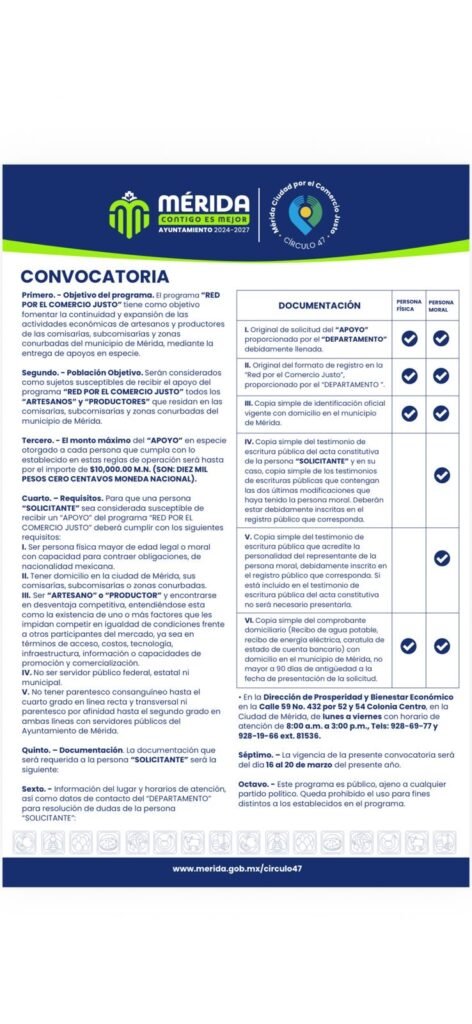 Podrán participar artesanos y productores que residan en las comisarías, subcomisarías o zonas conurbadas del municipio de Mérida, y que se encuentren en desventaja competitiva, es decir, que enfrenten dificultades para competir en igualdad de condiciones dentro del mercado debido a factores como acceso limitado a tecnología, infraestructura, promoción o comercialización.