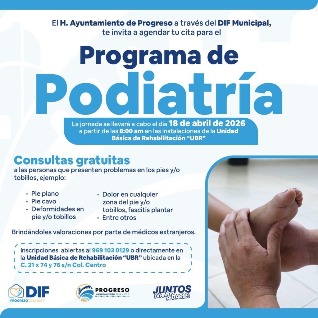 Progreso, Yuc 24 de marzo– El H. Ayuntamiento de Progreso, encabezado por el alcalde Erik Rihani González, a través del Sistema para el Desarrollo Integral de la Familia (DIF) Municipal, a cargo de Leslie Cristina González Gamboa, invita a la ciudadanía a participar en el Programa de Podiatría, dirigido a personas que presentan problemas en los pies y/o tobillos, con el objetivo de acercar servicios de salud especializados de manera gratuita.