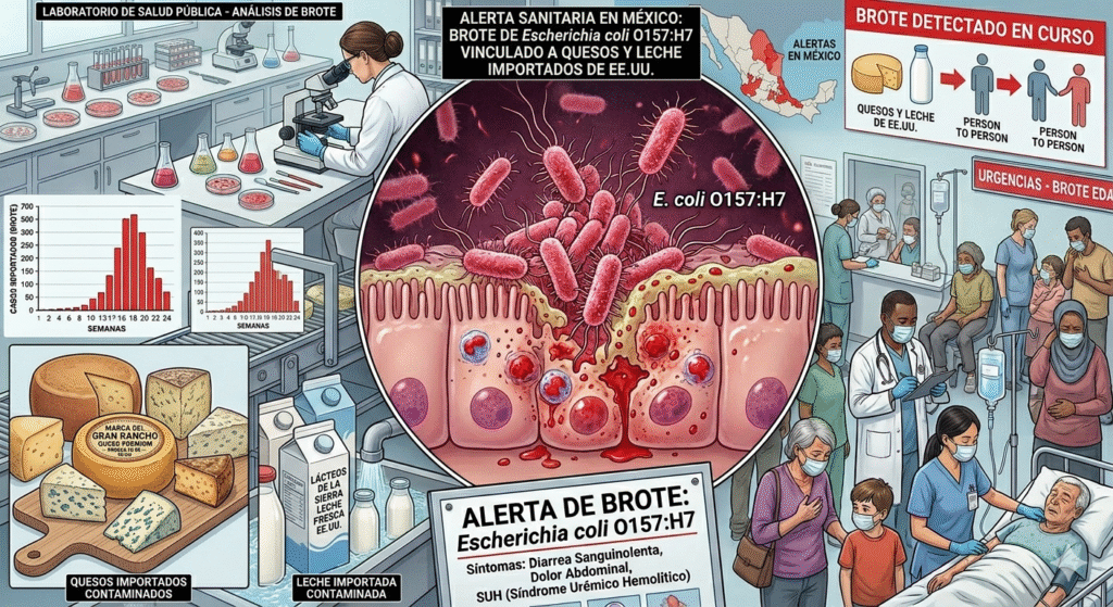 En su alerta zoosanitaria, el Senasica reporta que el 26 de marzo de 2026 se informó a México que los Centros para el Control y la Prevención de Enfermedades (CDC), autoridades estatales de salud pública y la Administración de Alimentos y Medicamentos de Estados Unidos (FDA)investigan un brote multiestatal de infecciones por Escherichia coli O157:H7, en el que la leche y el queso crudos de la marca Raw Farm se identificaron como la fuente probable de infección.