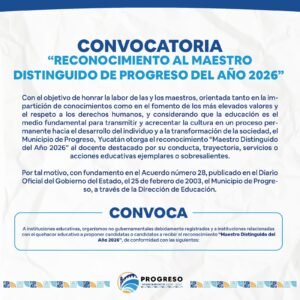 Progreso, Yuc 5 de abril– El H. Ayuntamiento de Progreso, encabezado por el alcalde Erik Rihani González, a través de la Dirección de Educación, reitera la convocatoria para el reconocimiento “Maestro Distinguido de Progreso 2026”.