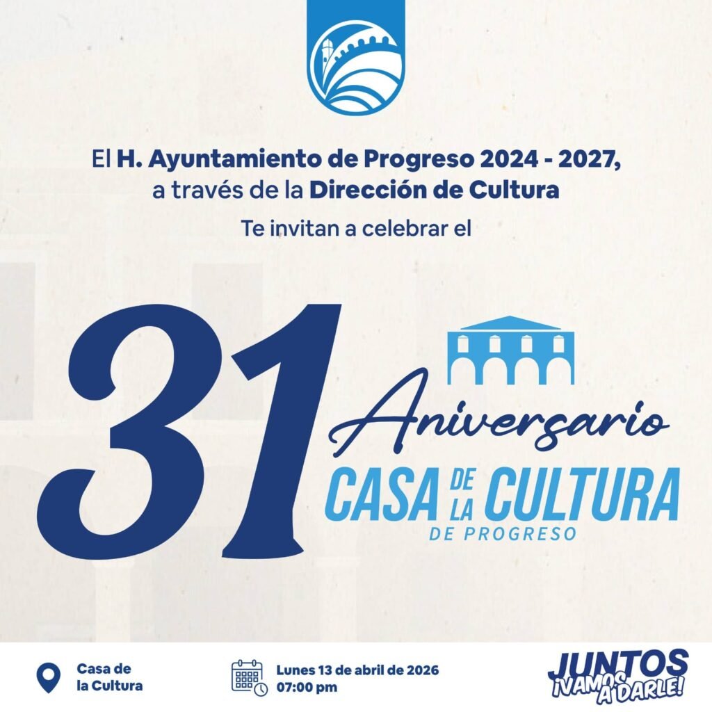 Progreso, Yuc 9 de abril.– El H. Ayuntamiento de Progreso, encabezado por el alcalde Erik José Rihani González, a través de la Dirección de Cultura, a cargo de Cruz David Chan Martínez, invita a la ciudadanía a celebrar el 31 aniversario de la Casa de la Cultura de Progreso, un espacio emblemático que ha sido punto de encuentro para el arte, la formación y la expresión cultural en nuestro municipio.